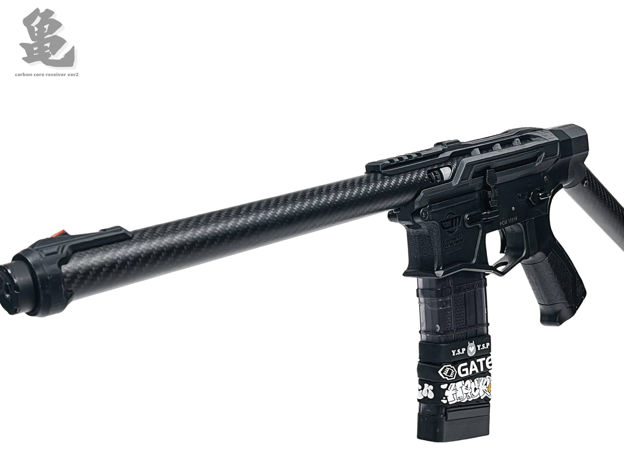 3Dプリンターで製作したオリジナルデザインのアッパーレシーバーと軽量カーボンパイプを採用した、G&G製レシーバーに合わせた専用設計の商品です。ホップ調整用の窓を左右に追加し、使いやすさを向上。外径28mmのトレーサー(XT301-MK2など)をカーボンパイプ内に収納することで、統一感のあるデザインと破損防止を実現しました。集光チューブを使用したアイアンサイトは素早いサイティングを可能にします。さらに、パイプ内の空洞を活用した消音機能や、アイディア次第でカスタマイズ加工も楽しめる、機能性と拡張性を兼ね備えたレシーバーです。